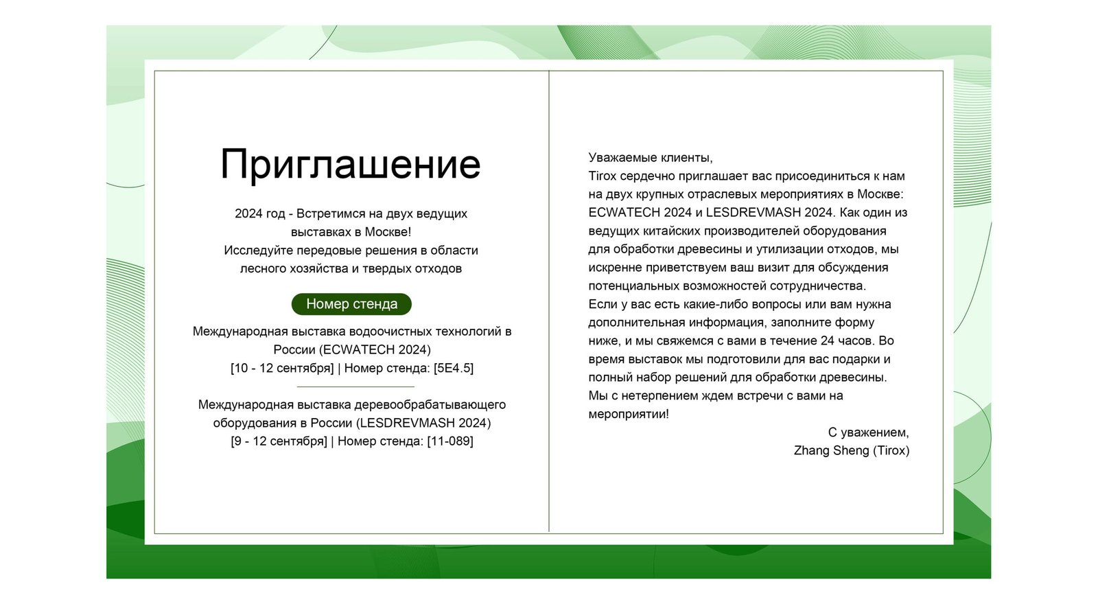 Zhangsheng Machinery (Tirox) является одним из ведущих экспортных производителей деревообрабатывающего оборудования в Китае. На выставке этого года мы продемонстрируем наши новейшие решения по переработке древесных отходов. Приходите и узнайте, как наше современное оборудование может способствовать развитию вашего бизнеса. Не упустите шанс встретиться с нами!